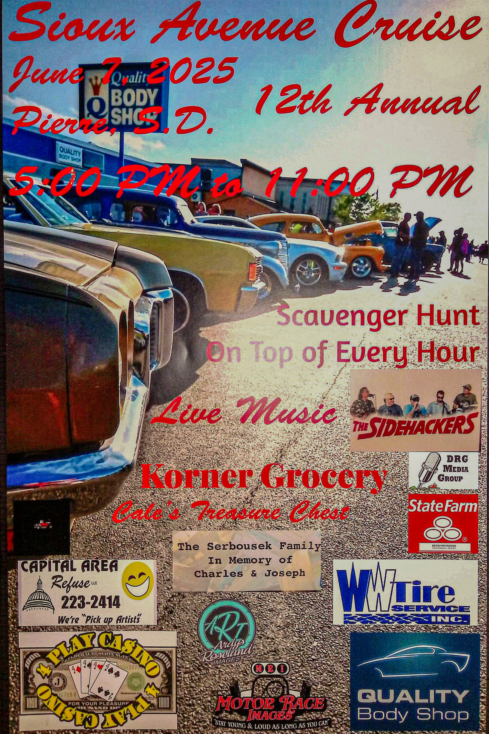 12th Annual Sioux Avenue Cruise ~ Pierre, SD ~ June 7, 2025 ~ Featuring “The Sidehackers” – 7-11p!