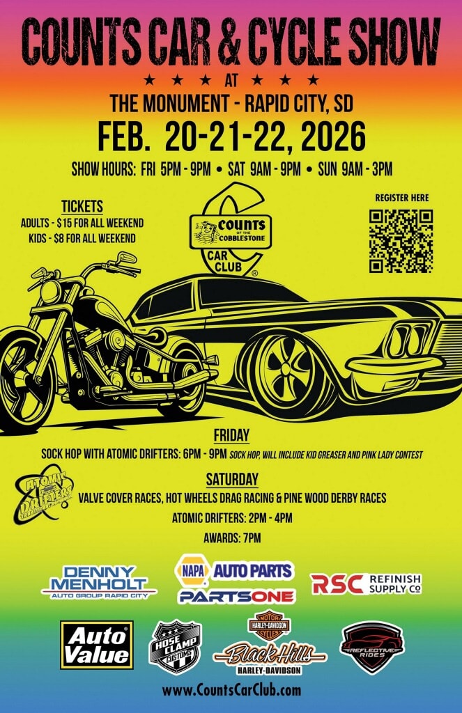 Counts Car and Cycle Show – The Monument, Rapid City, SD ~ Feb 20-22, 2026 + Add to Google Calendar + iCal / Outlook export 00 days 00 hours 00 minutes 00 seconds Date Feb 20 - 22 2026 Time 5:00 pm - 3:00 pm Location Rapid City, SD Rapid City, SD Share this event Search for: Recent Posts Happy HallowThanksMas !!! Celebrating Home Harding’s100th Birthday! October Meeting~ Jakes Good Times Place ~ October 20, 2025 Rotisserie for Sale September Meeting~ Jakes Good Times Place ~ September 15, 2025 Archives October 2025 September 2025 August 2025 July 2025 June 2025 May 2025 April 2025 March 2025 February 2025 December 2024 November 2024 October 2024 September 2024 August 2024 July 2024 June 2024 May 2024 April 2024 March 2024 February 2024 January 2024 December 2023 November 2023 October 2023 September 2023 August 2023 July 2023 June 2023 May 2023 April 2023 March 2023 February 2023 January 2023 December 2022 November 2022 October 2022 September 2022 August 2022 July 2022 June 2022 May 2022 April 2022 March 2022 February 2022 January 2022 December 2021 November 2021 October 2021 September 2021 August 2021 July 2021 June 2021 April 2021 March 2021 February 2021 January 2021 December 2020 November 2020 October 2020 September 2020 August 2020 July 2020 June 2020 May 2020 April 2020 March 2020 February 2020 January 2020 December 2019 November 2019 October 2019 September 2019 August 2019 July 2019 June 2019 May 2019 April 2019 March 2019 February 2019 January 2019 December 2018 Categories Street Masters