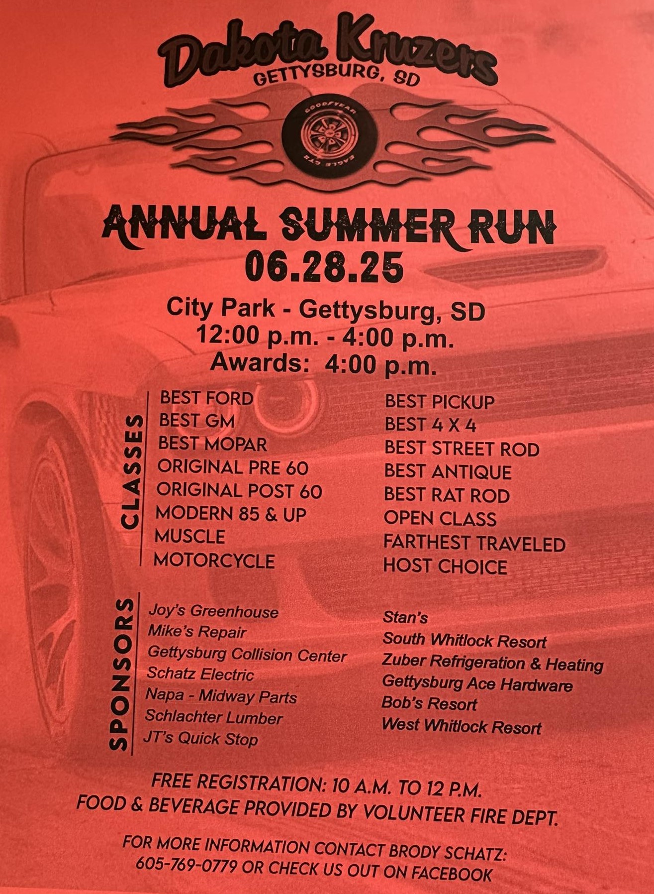 Dakota Kruzers Annual Summer Run ~ Gettysburg, SD ~ June 28, 2025 Saturday, June 28, 2025 Registration ~ 10am Show ~ Noon – 4pm Awards at 4pm + Add to Google Calendar + iCal / Outlook export Date Jun 28 2025 Expired! Time 10:00 am - 5:00 pm Location Gettysburg Park Gettysburg, SD Organizer Dakota Kruzers Car Club Share this event Search for: Recent Posts POP UP Cruise in Support of Fellow Street Master’s Member, Greg Stluka ~ Pizza Ranch, Fort Pierre, SD ~ Monday, April 6, m2026 Craig Arneson loses his father, Marvin Arneson Rain or Shine!!! NSRA Safety Inspections / Potluck at Graham Tire ~ Pierre, SD ~ April 18, 2026 Street Masters Giving Back to the Pierre/Fort Pierre Community All the 2026 Dam Run Forms are Live… Archives April 2026 March 2026 February 2026 January 2026 December 2025 November 2025 October 2025 September 2025 August 2025 July 2025 June 2025 May 2025 April 2025 March 2025 February 2025 December 2024 November 2024 October 2024 September 2024 August 2024 July 2024 June 2024 May 2024 April 2024 March 2024 February 2024 January 2024 December 2023 November 2023 October 2023 September 2023 August 2023 July 2023 June 2023 May 2023 April 2023 March 2023 February 2023 January 2023 December 2022 November 2022 October 2022 September 2022 August 2022 July 2022 June 2022 May 2022 April 2022 March 2022 February 2022 January 2022 December 2021 November 2021 October 2021 September 2021 August 2021 July 2021 June 2021 April 2021 March 2021 February 2021 January 2021 December 2020 November 2020 October 2020 September 2020 August 2020 July 2020 June 2020 May 2020 April 2020 March 2020 February 2020 January 2020 December 2019 November 2019 October 2019 September 2019 August 2019 July 2019 June 2019 May 2019 April 2019 March 2019 February 2019 January 2019 December 2018 Categories Street Masters